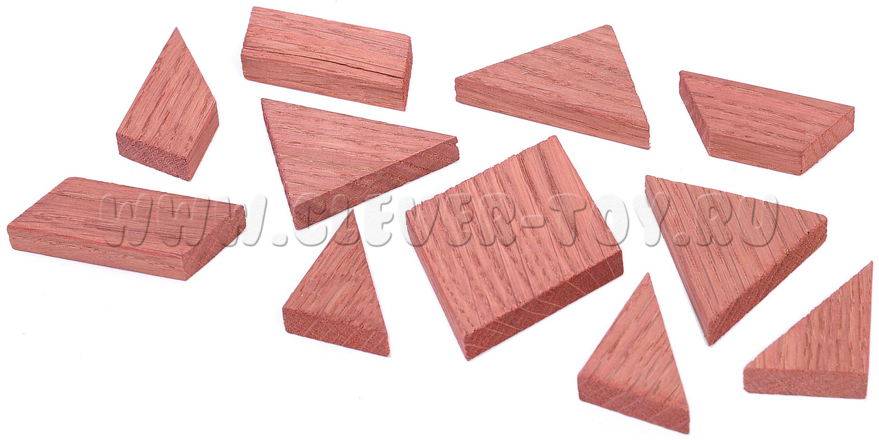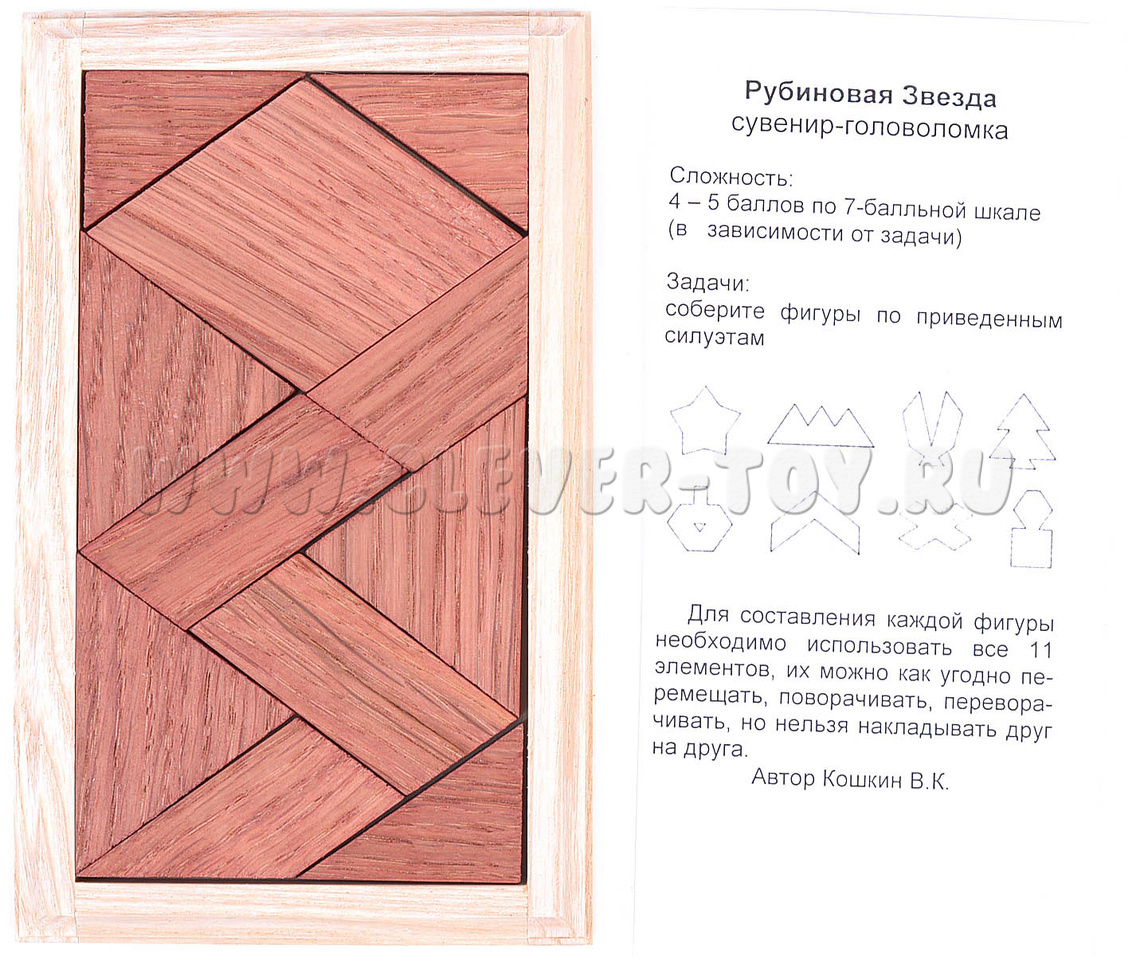 Головоломка "Рубиновая звезда" представляет собой набор из 11 деталей, из которых нужно создать 8 различных фигур по рисункам из инструкции. Каждая деталь имеет уникальную форму и размер, и все они окрашены в красный цвет.