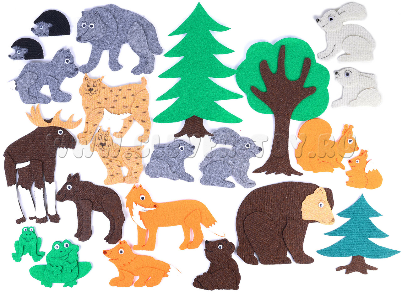 Набор "Дикие животные" - это ещё и динамический театр на плоскости! Вы и ваш малыш сможете придумать и поставить свой первый спектакль с участием ковролиновых героев, дать им разный голос и характер, разыграть с их помощью любимые сказки.