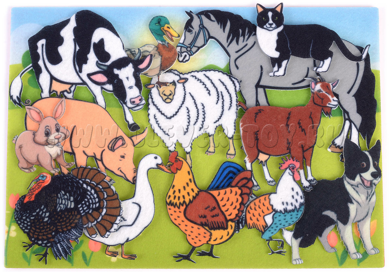 Развивающая игра-конструктор из фетра "Ферма". Комплектация: Набор из 13 фигурок домашних животных, Игровое поле с карманом 20*30см. Материал: фетр.