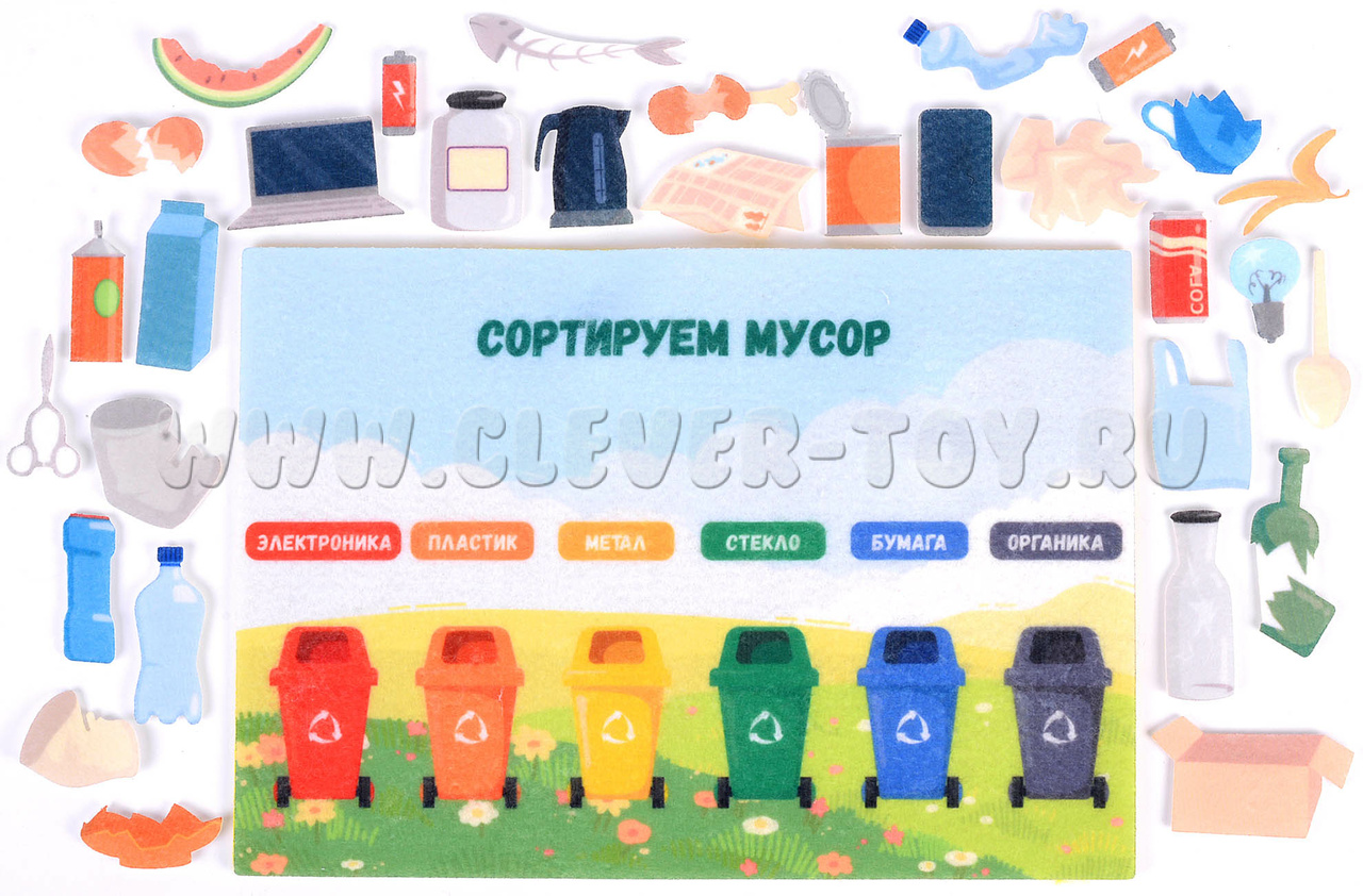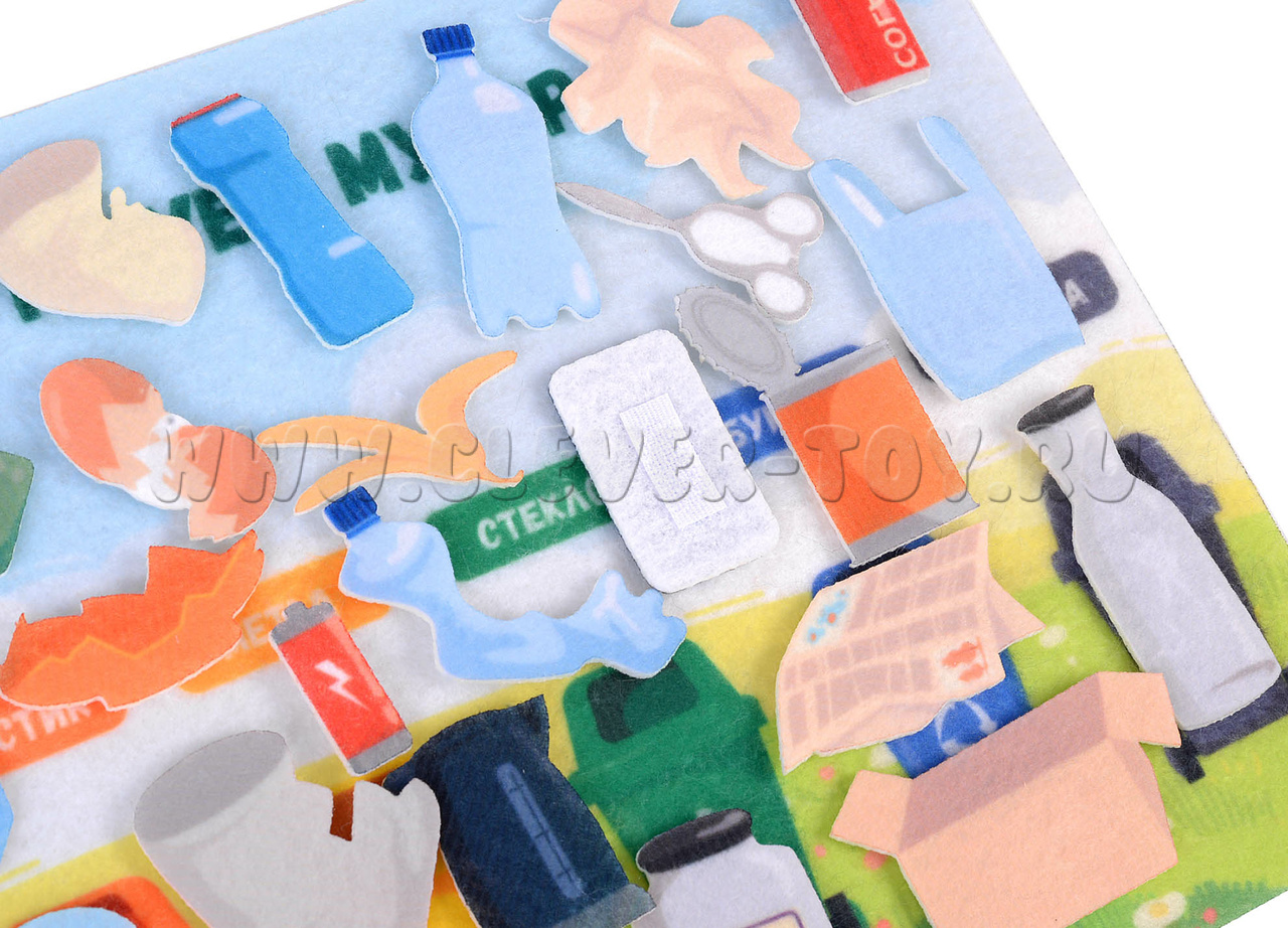В наборе вы найдёте 31 фигурку, выполненную из мягкого и приятного на ощупь материала — фетра. Каждая фигурка представляет собой определённый вид мусора: бумага, пластик, стекло, органические отходы и т. д. Фигурки крепятся к игровому полю с помощью липучек, что позволяет детям легко и безопасно сортировать их.