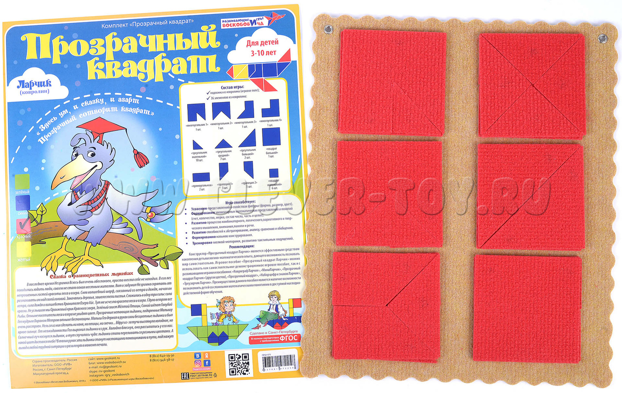 Конструктор «Прозрачный квадрат Ларчик» - эффективное средство накопления детьми логико-математического опыта, дающего возможность познавать мир самостоятельно. Игровое пособие можно использовать как самостоятельно, так и с развивающими играми и пособиями: «Коврограф Ларчик», «МиниЛарчик», «Прозрачный квадрат Ларчик (других цветов)», «Прозрачный квадрат», «Набор цифр и знаков Ларчик», «Треузорчик Ларчик».