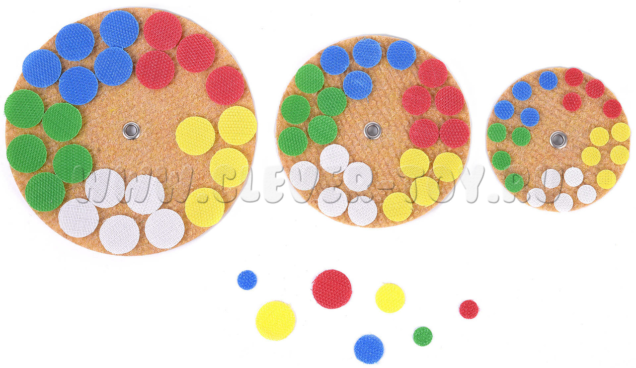 • кружки из контактной ленты 5 цветов (красный, жёлтый, зелёный, синий, белый), 3-х размеров (диаметр 10,15,20 мм) – 75 шт.,