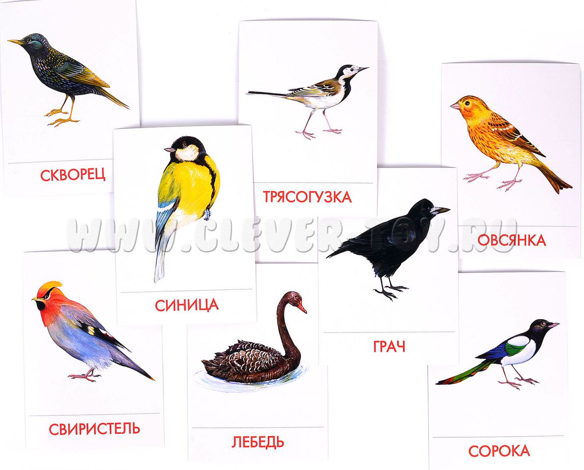 В набор входит 16 карточек с изображениями птиц, обитающих в городе: