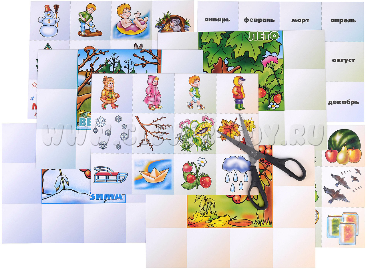 Перед началом игры родителю или педагогу необходимо разрезать карточки по пунктирным линиям. Большие карты (игровые поля) раздайте участникам поровну. 32 маленькие карточки с картинками перемешайте и выложите отдельно изображением вниз, так же поступите с карточками с названиями месяцев. По команде участники начинают выбирать из маленьких карточек подходящие к их игровым полям. Побеждает тот, кто сделал это правильно и быстрее всех остальных.