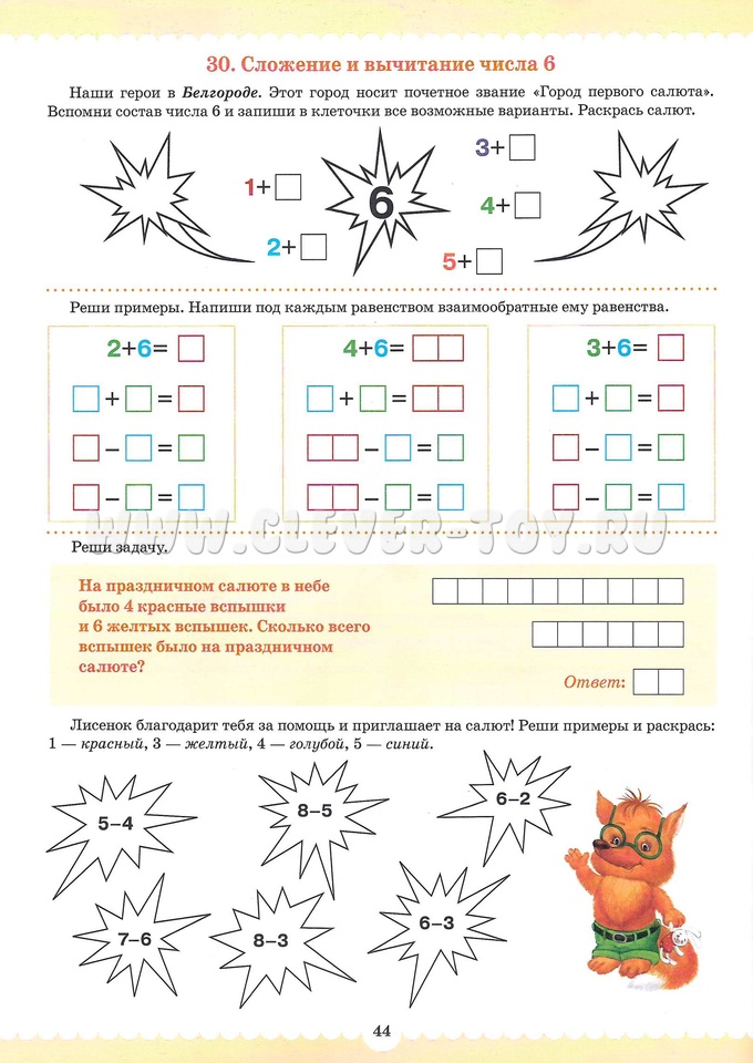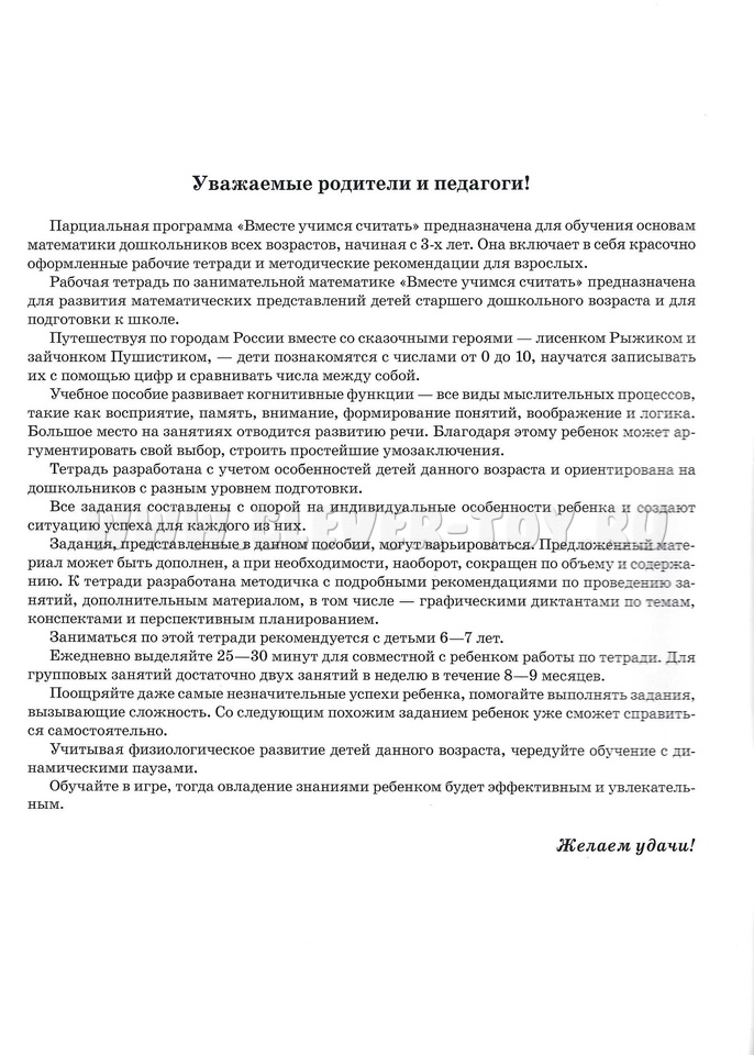 Рабочие тетради из серии "Вместе учимся считать" для детей 6-7 лет помогут сделать освоение начал математики увлекательным для дошкольников. Их авторы - педагоги-практики, много лет проработавшие с детьми дошкольного и младшего школьного возраста. Вместе со сказочными персонажами - лисенком Рыжиком и зайчонком Пушистиком - малыши продолжат начатое в предыдущих тетрадях серии знакомство с цифрами, запомнят их последовательность в числовом ряду, научатся логически мыслить и решать простейшие математические задачи. Тетрадь предназначена для индивидуальных и групповых занятий с дошкольниками 6-7 лет. Может быть использована как в группе детского сада, так и при занятиях дома.
