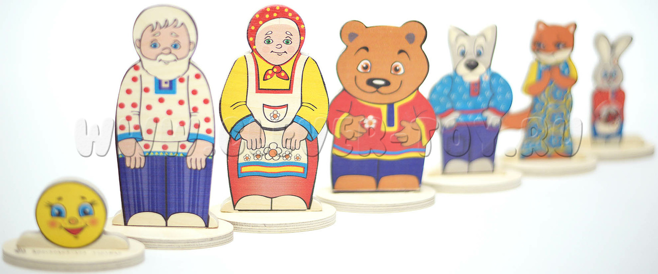 - 7 деревянных фигурок на подставках (Колобок, Дед, Бабка, заяц, медведь, волк, лиса) размером от 4 до 12 см.