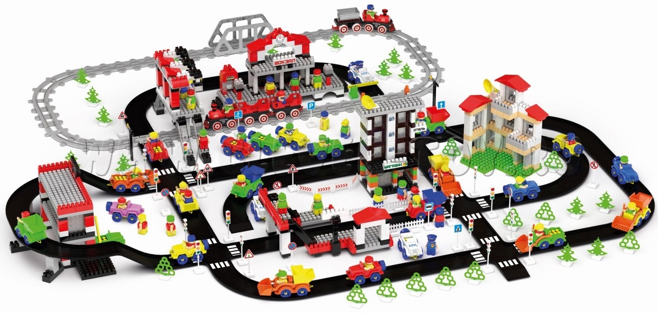 В комплект входят: кубики различных цветов и размеров, сборные машинки, фигурки человечков и набор инструментов для них, элементы для сборки дорожного полотна, набор наклеек "Дорожные знаки", элементы декора (дорожные знаки, деревья, светофоры, заборы, окна, двери, крыши)