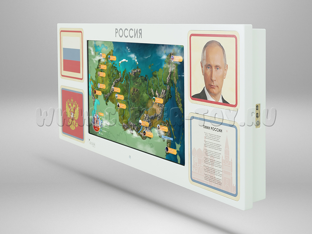 Настенная интерактивная панель с сенсорным монитором, декорированная основной символикой РФ: герб, флаг, гимн, портрет президента. Разработана для реализации программы патриотического воспитания в школе, детском саду или других образовательных учреждениях. Подходит для оформления входной зоны и классов.