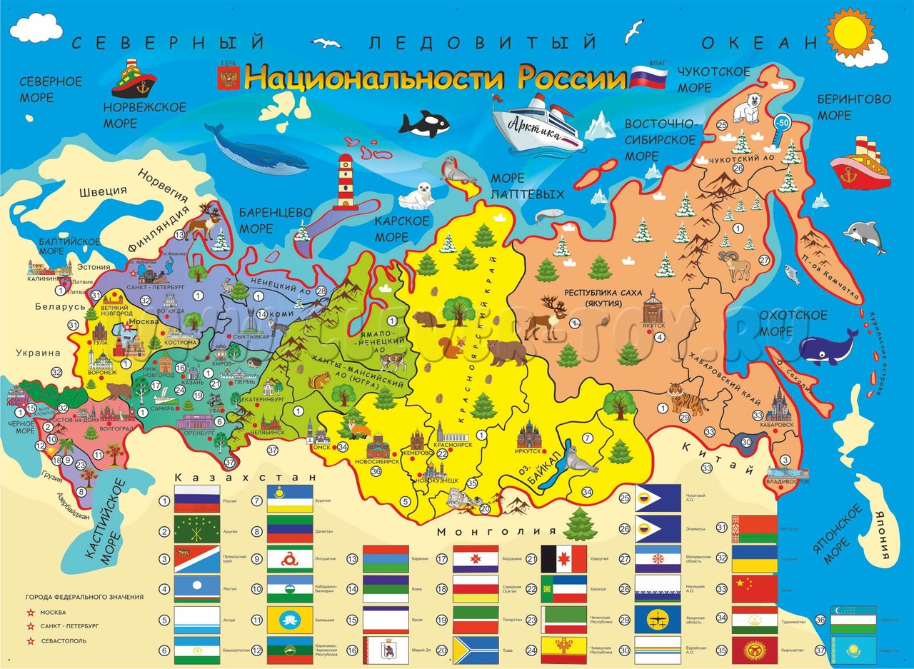 Россия - многонациональное государство, на ее территории проживает более 190 народов. На карте обозначены цифрами места компактного проживания наиболее многочисленных народностей.