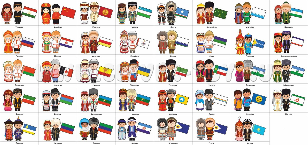 В базовый вариант входят такие национальности как: тувинцы, алтайцы, чуваши, якуты, осетины, крымские татары, черкесы, адыгейцы, коми, хакасы, нанайцы, балкарцы, карелы, чукчи, евреи, узбеки, марийцы, чеченцы, таджики, аварцы, украинцы, русские, эвенки, белорусы, татары, ингуши, кабардинцы, китайцы, буряты, лезгины, башкиры, карачаевцы, эскимосы, киргизы, калмыки, ненцы, мордва, удмурты.