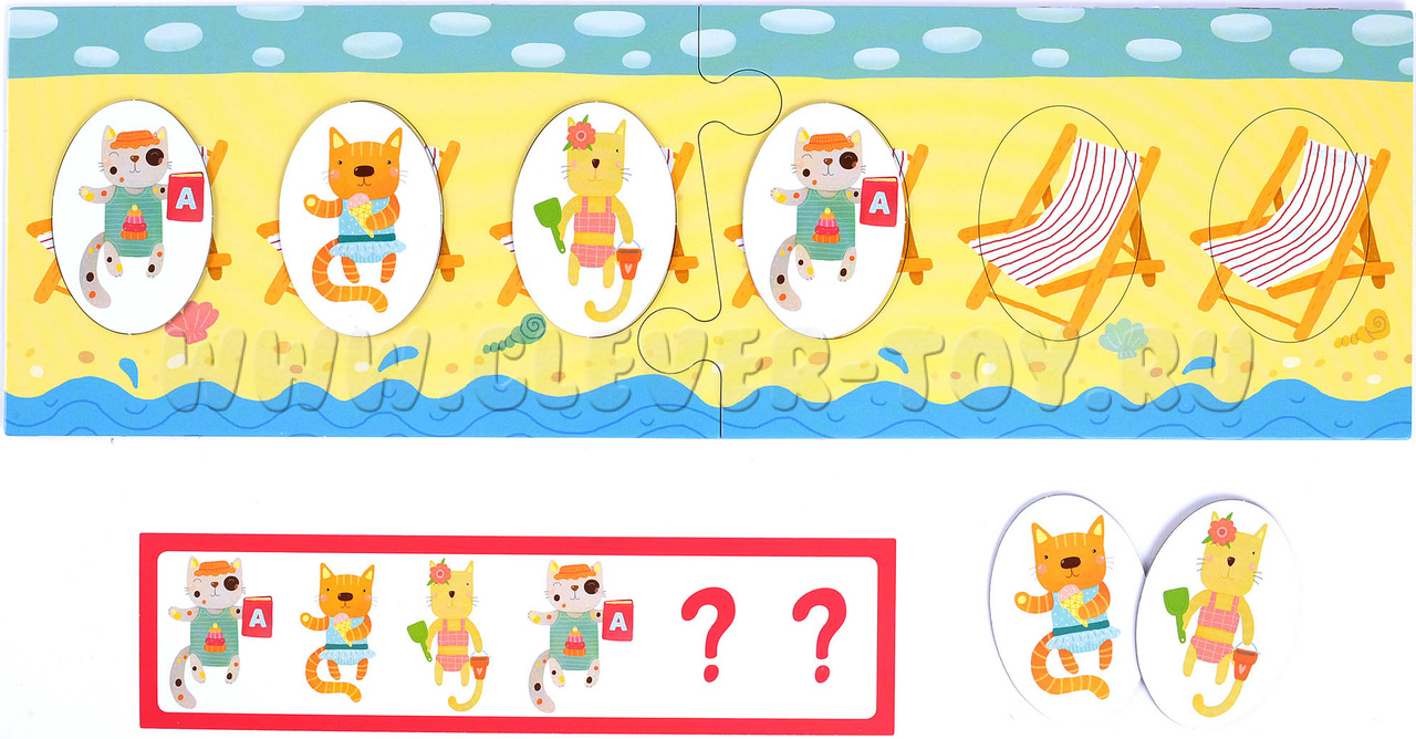 - Игра для поля с шезлонгами (обратная сторона игрового поля). Начинайте с заданий в зеленой рамке: воспроизводите заданную карточкой последовательность котят. Более сложные задания предлагают не только продолжить ряд, но и установить взаимосвязь и закончить последовательность самостоятельно. К этим заданиям стоит переходить, когда малыш уверенно справляется с зелеными карточками.