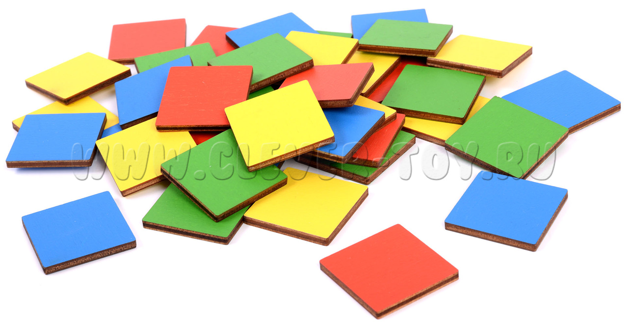 1. Игра "Цветные квадратики". Рассмотрите игровое поле вместе с ребенком. Посчитайте все фишки, спросите, фишек какого цвета больше (меньше) всего? Посчитайте, сколько фишек помещается на одной части игрового поля, на другой? Где больше? (Поровну)