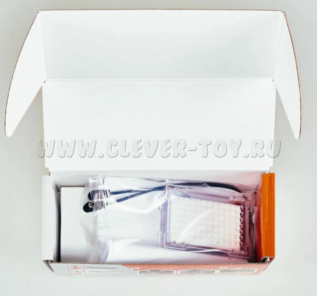 На корпусе имеются отверстия для соединения с механическими блоками конструктора "Роботрек", единый разъем для подключения зарядного устройства и потребителей питания, внутри корпуса имеется защитная подложка.