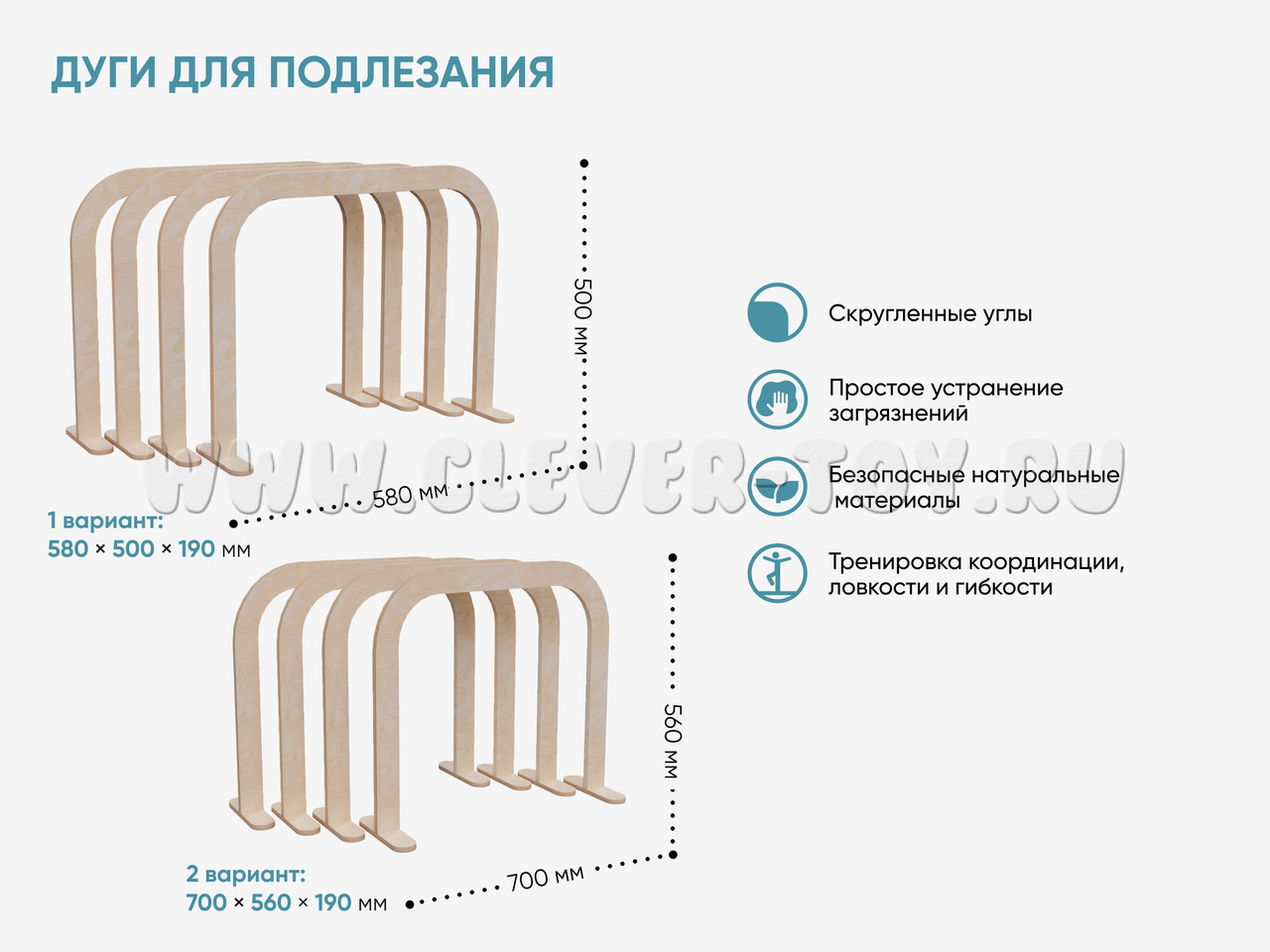 Дуги выполнены из высококачественных и прочных материалов, безопасных для использования детьми. Соответствует актуальным ГОСТам на детскую мебель и инвентарь для спортивных залов, требованиям СанПиН и пожарной безопасности, рекомендациям ФОП ДО по созданию развивающей среды для детей. Гладкие поверхности просты в уходе: достаточно влажной уборки для поддержания высокого уровня гигиены.
