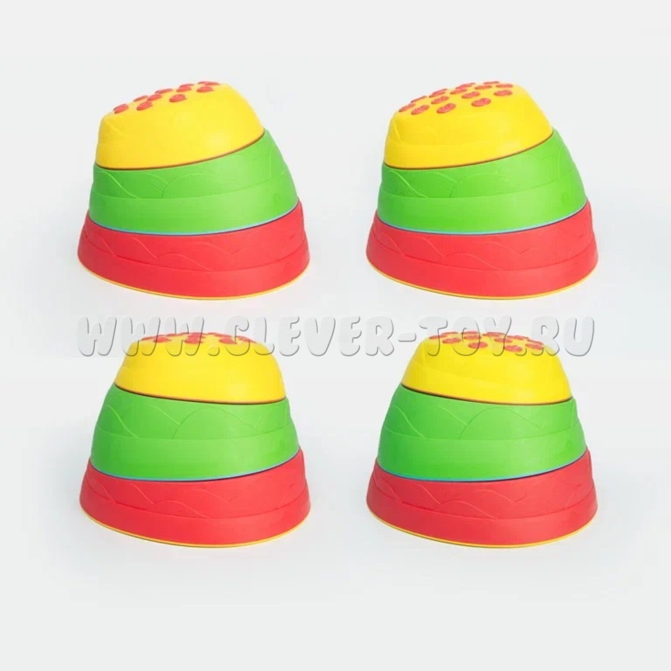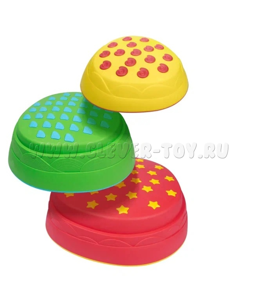 Набор состоит из 6 камешков в 3-х размерах и 3-х цветов, выполненных из прочного пластика с ребристой поверхностью, что помогает избежать скольжения.