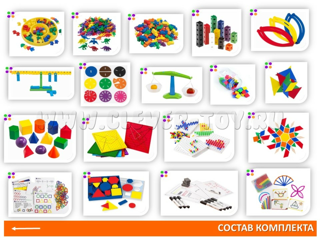Комплект состоит из многофункциональных пособий, которые помимо математических навыков выполняют также и ряд других функций: